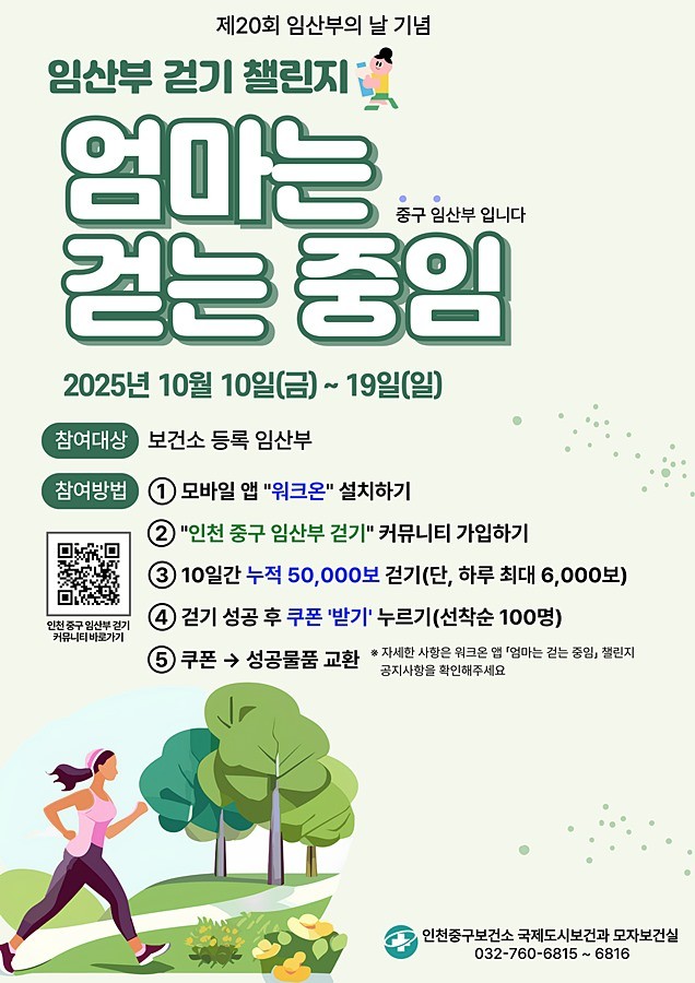 인천시 중구(구청장 김정헌)는 ‘제20회 임산부의 날(10월 10일)’을 맞아 임산부 걷기 챌린지, 홍보 부스 등 다양한 프로그램을 마련했다고 13일 밝혔다.