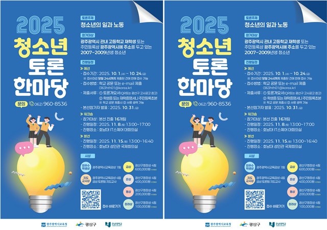 박병규 광산구청장은 “이번 토론한마당은 청소년이 직접 사회 문제를 토론하는 장으로 민주적 소통 역량을 키우는 중요한 기회”라며 “지역사회와 함께 청소년들이 미래의 주역으로 성장할 수 있도록 적극 지원하겠다”고 전했다.