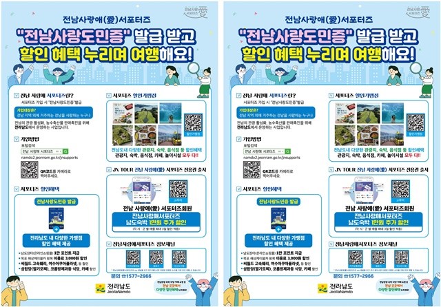 전남 사랑애 서포터즈는 지역 소멸 위기를 극복하고 농특산물 판매 촉진, 관광 활성화를 위해 지난 2022년 9월부터 운영되고 있다. 가입자에게는 전남 도내 관광지, 숙박, 음식점, 전통시장 등 할인가맹점에서 할인 혜택을 받을 수 있는 ‘전남사랑도민증’이 발급된다.