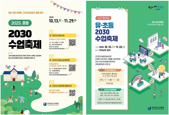 [위키트리 광주전남취재본부 노해섭 기자]전라남도교육청이 11월 29일까지 전남 곳곳에서 ‘2030수업축제’를 진행한다. 이번 축제는 ‘전남 수업대전환, 2030교실에서 길을 찾다’를 주제로, 교사 주도 수업 혁신과 미래 교육의 방향을 모색한다.