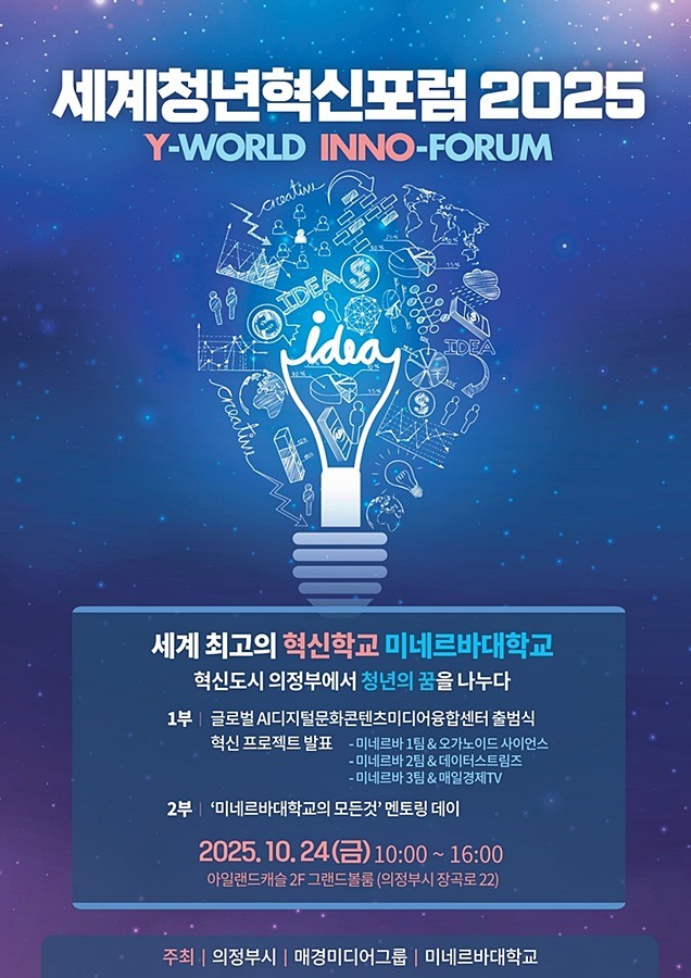 경기 의정부시(시장 김동근)는 10월 24일 오전 10시, 아일랜드캐슬 2층 그랜드볼룸에서 ‘세계청년혁신포럼 2025(Y-WORLD INNO-FORUM)’를 개최한다.