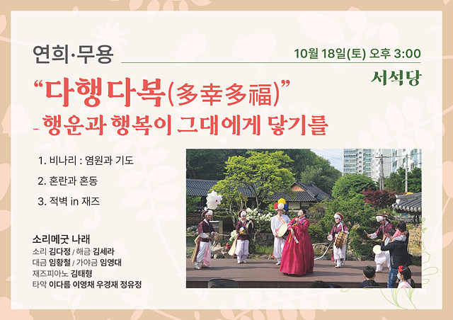 청년 국악 단체 '소리메굿 나래'가 선보이는 융합 공연 <다행다복(多幸多福)>은 전통과 현대가 어우러져 혼돈의 시대를 살아가는 우리에게 희망의 메시지를 건넨다.