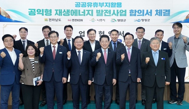 [위키트리 광주전남취재본부 노해섭 기자]전라남도가 나주시, 영암군, 영광군, 한전KDN과 손잡고 공익형 재생에너지 발전사업을 본격 추진한다. 15일 열린 이번 협약은 새정부 재생에너지 대전환 정책과 맞물려, 공공유휴지에 설치한 태양광 등에서 발생한 수익을 도민과 공유하는 모델을 표방한다.