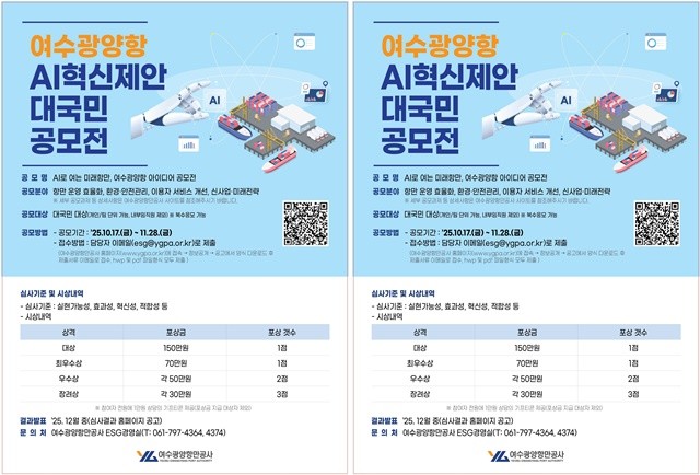 [위키트리 광주전남취재본부 노해섭 기자]여수광양항만공사(YGPA, 사장직무대행 황학범)는 항만 현장의 문제를 국민과 함께 해결하고, AI 기술을 활용한 스마트 항만 구현을 위해 ‘여수광양항 AI 혁신제안 대국민 공모전’을 개최한다고 17일 밝혔다.