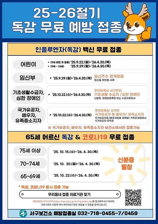 접종은 관내 의료기관 220곳에서 가능하며, 의료기관 정보는 ‘예방접종도우미’ 누리집(https://nip.kdca.go.kr) 내 ‘의료기관 찾기’ 또는 인천서구보건소 홈페이지를 통해 확인할 수 있다.
