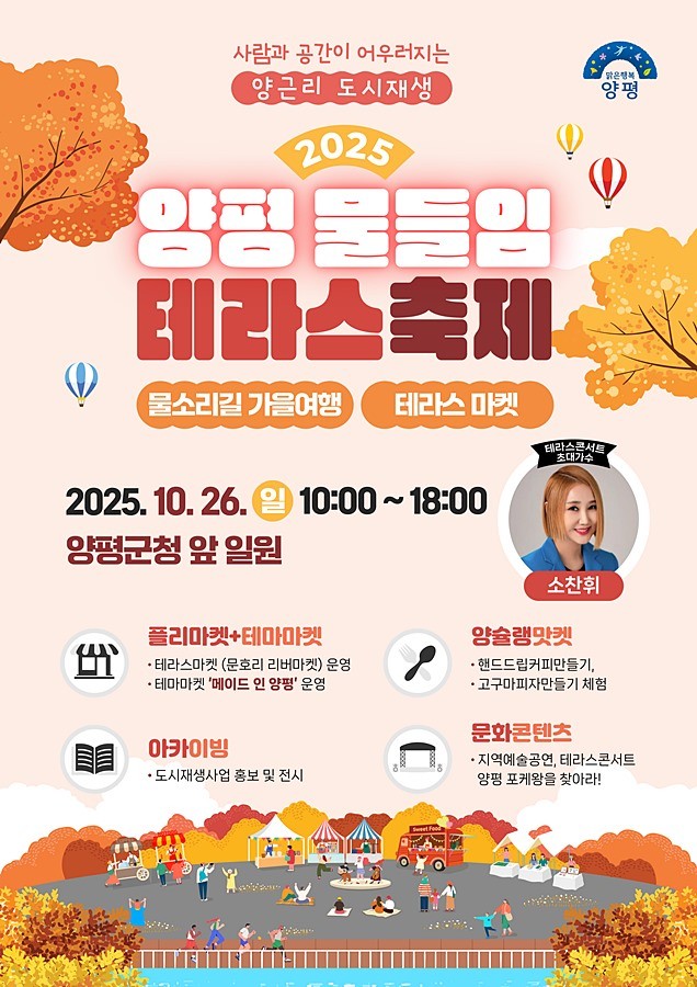경기 양평군(군수 전진선)은 오는 26일, 양평군청 앞 특설무대 및 주차장 일원에서 ‘2025 양평 물들임 테라스 축제’를 개최한다고 밝혔다.