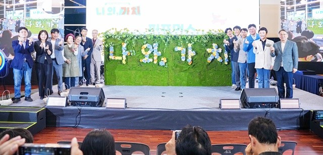강기정 광주광역시장이 18일 오후 시청 시민홀에서 열린 '제4회 광주사회적경제 박람회'에 참석해 전진숙·정준호 국회의원 등 내빈들과 퍼포먼스를 하고 있다./광주광역시 제공