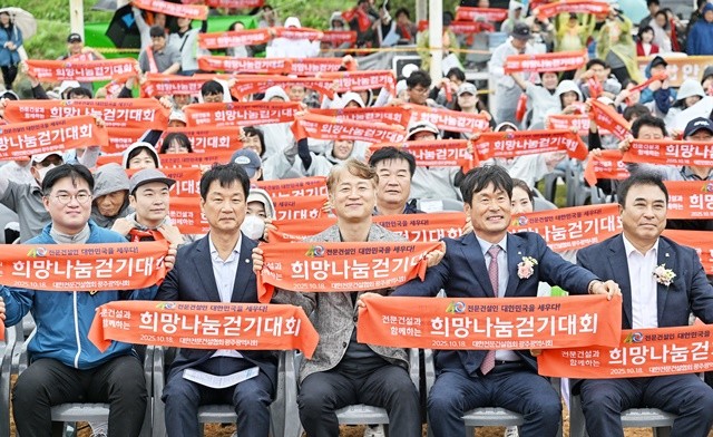 김이강 광주 서구청장이 18일 영산강변 일원 제10회 광주서창억새축제 주무대에서 열린 ‘전문건설과 함께하는 희망나눔 걷기대회’에서 참석자들과 기념촬영을 하고 있다. 광주 서구 제공