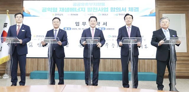 [위키트리 광주전남취재본부 노해섭 기자] 영암군(군수 우승희)이 15일 전남도청에서 전라남도, 나주시, 영광군, 한전KDN(주)과 ‘공공 유휴부지 활용 공익형 재생에너지 발전사업 업무협약’을 체결했다.