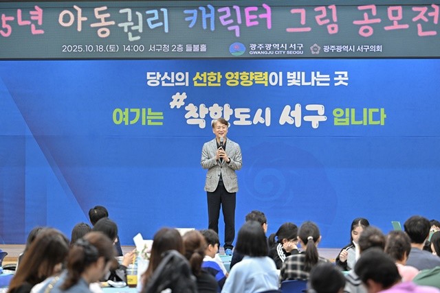 [위키트리 광주전남취재본부 노해섭 기자] 김이강 광주시 서구청장이 18일 서구청 들불홀에서 열린 ‘아동권리 캐릭터 그림 공모전 시상식’에서 기념사를 하고 있다. 광주 서구 제공