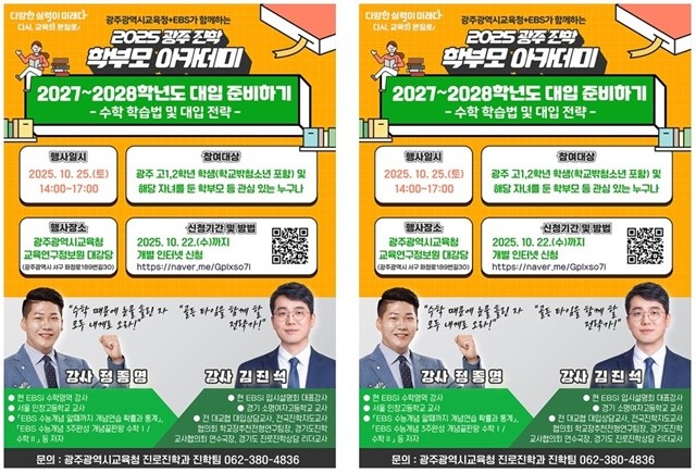 아카데미 참여를 희망하는 학생, 학부모는 오는 22일까지 광주진로진학지원센터 누리집을 통해 신청하면 된다. 당일 현장 접수도 가능하다. 특강은 행사가 끝난 후 EBSi 홈페이지에 탑재될 예정이다.