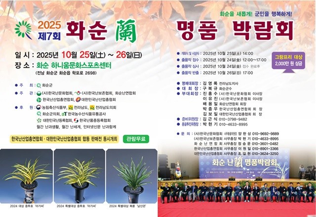 [위키트리 광주전남취재본부 노해섭 기자]전남 화순군이 국내 최대 규모의 난 축제인 ‘제7회 2025 화순 난 명품 박람회’를 10월 25~26일 하니움문화스포츠센터에서 개최한다. 전문가와 애호가들이 한자리에 모여 한국춘란의 다양한 매력을 선보일 예정이다.