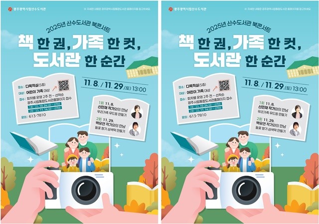 산수도서관을 이용하는 어린이 가족은 누구나 참여할 수 있으며, 참가 신청은 10월 24일부터 광주시립도서관 누리집을 통해 선착순(1회차-8일 15가족, 2회차-29일 12가족) 접수한다. 자세한 사항은 누리집을 참고하거나 산수도서관(613-7810)으로 문의하면 된다.