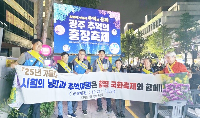 [위키트리 광주전남취재본부 노해섭 기자]함평군 대한민국 국화동호회가 ‘2025 대한민국 국향대전’ 성공을 위한 발 빠른 홍보에 나섰다. 지난 15일 광주 충장축제 개막식에서 직접 어깨띠를 두르고 주요 콘텐츠를 소개하며 국향대전을 알렸다.