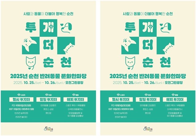 [위키트리 광주전남취재본부 노해섭 기자]순천시(시장 노관규)는 오는 25일(토), 26일(일) 양일간 오천그린광장에서 반려동물은 물론 반려인과 비반려인이 함께 즐기는 ‘2025년 반려동물 문화한마당 행사’를 개최한다고 밝혔다.