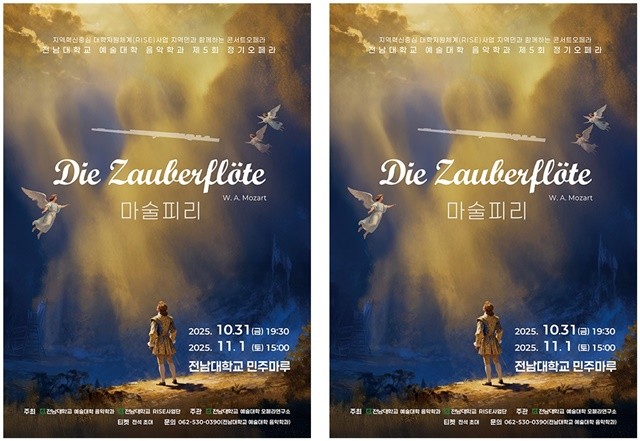 전남대 예술대학 음악학과는 오는 10월 31일(금) 오후 7시 30분과 11월 1일(토) 오후 3시, 전남대학교 민주마루에서 제5회 정기오페라 ‘마술피리’(Die Zauberflöte)를 무대에 올린다.
