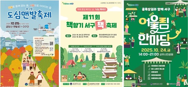 [위키트리 광주전남취재본부 노해섭 기자]광주시 서구(구청장 김이강)가 10월 마지막 주말인 24~25일 ‘착한도시’의 가치와 나눔 문화를 알리는 다채로운 축제를 연다. 주요 축제로는 어울림한마당, 책향기 서구 책축제, 도심맨발축제, 청년축제가 개최된다.