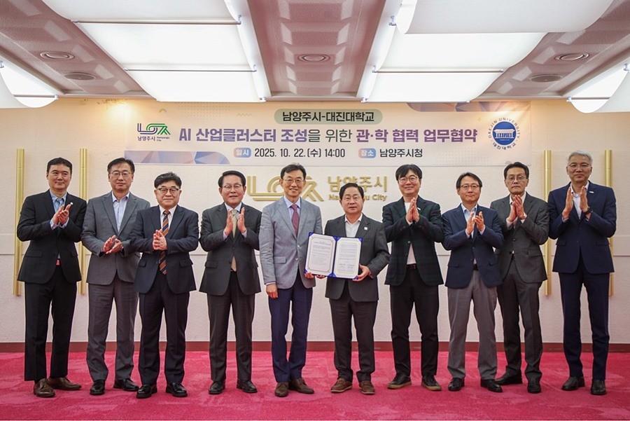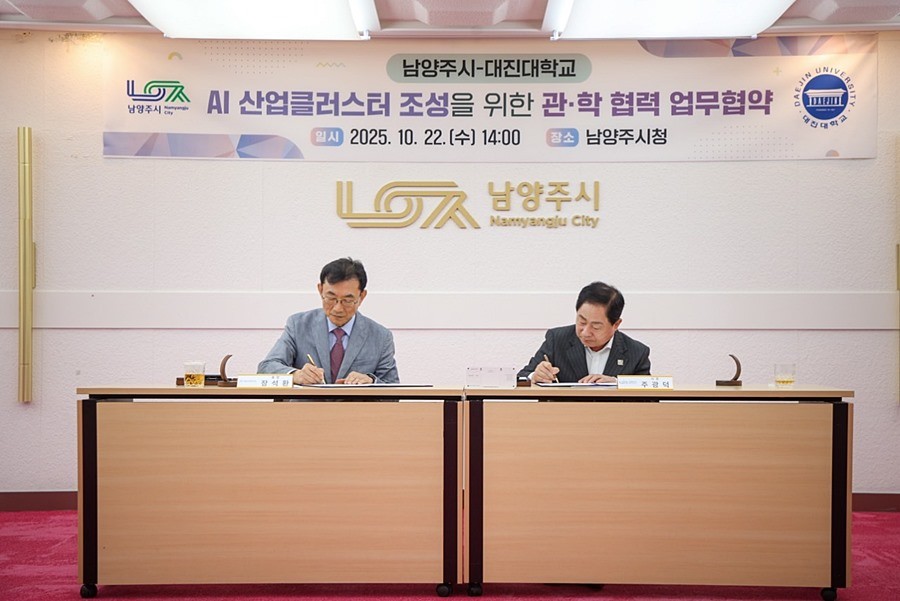 경기 남양주시(시장 주광덕)는 22일 시청에서 대진대학교(총장 장석환)와 ‘AI 산업클러스터 조성을 위한 관·학 협력 업무협약’을 체결했다고 밝혔다.