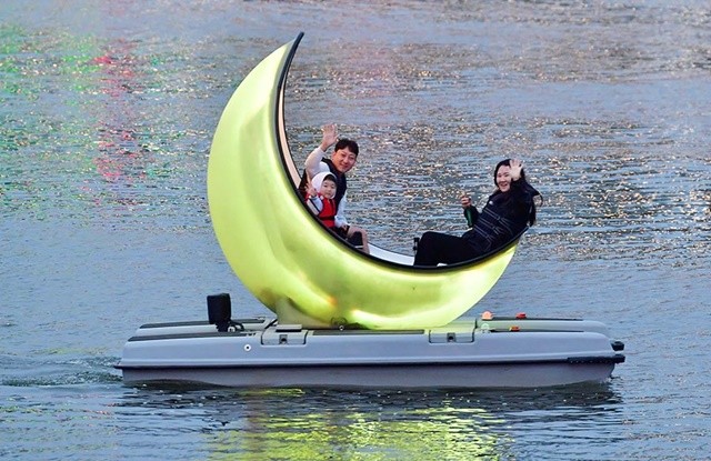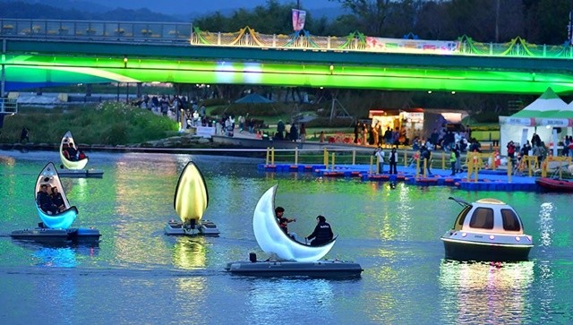 [위키트리 광주전남취재본부 노해섭 기자]장성 황룡강 가을꽃축제에서는 밤에도 다채로운 즐길거리를 만날 수 있다. 오후 6시 이후 문화대교 인근에서는 최대 3명이 탈 수 있는 달 모양의 ‘문보트’(2만 원), 최대 5명이 함께 타는 ‘UFO보트’(3만 원) 등 이색 수상체험이 인기다.