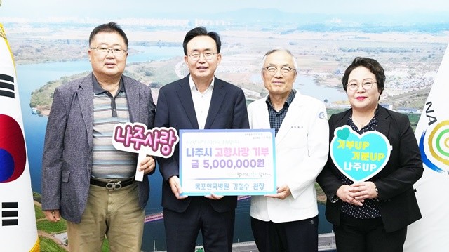 [위키트리 광주전남취재본부 노해섭 기자]전남 나주시(시장 윤병태)는 22일 목포한국병원 강철수 원장이 지역사회 발전을 위해 고향사랑기부금 500만 원을 기탁했다고 밝혔다.