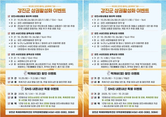 더불어, 강진읍 CNS 2차 아파트 상가 일원인 ‘강진 서성도담길 골목상권 이벤트’로는 11월 1일 오후 1~오후 7시에 바자회와 플리마켓, 버스킹공연(오후 5시), 무료 먹거리(팝콘 등), 체험부스(빼빼로 만들기, 뽑기 등)가 진행된다.