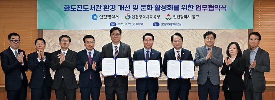 인천 동구(구청장 김찬진)는 인천시(시장 유정복), 인천시교육청(교육감 도성훈)과 23일 인천시청에서 화도진도서관 증·개축 추진을 위한 업무협약을 체결하였다고 밝혔다.