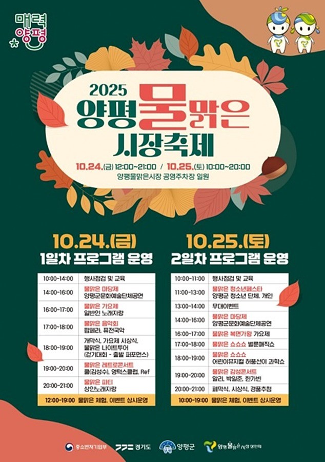 경기 양평군(군수 전진선) 양평물맑은시장의 대표 축제인 ‘2025 양평물맑은시장 축제’가 오는 10월 24일부터 25일까지 양평물맑은시장 공영주차장에서 열린다.