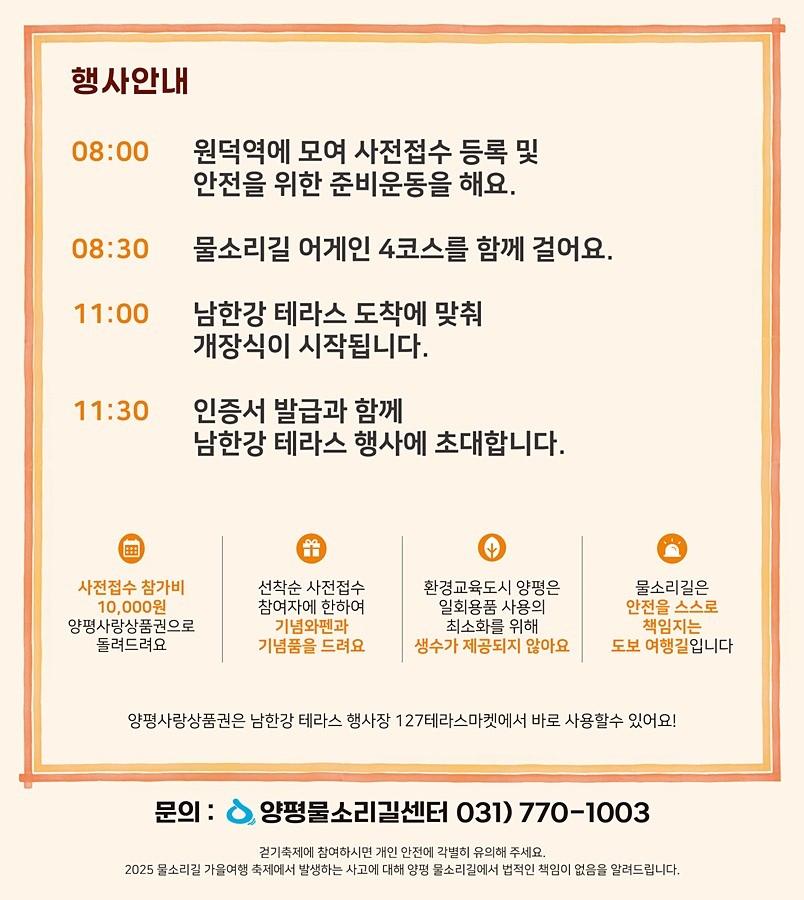 완주 후에는 새롭게 조성된 남한강테라스에서 개막 행사도 열려, 양평의 자연과 문화, 휴식이 어우러진 특별한 가을 도보여행을 즐길 수 있다.