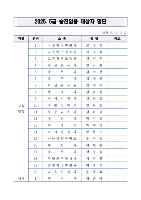 [위키트리 광주전남취재본부 노해섭 기자]전남도교육청(교육감 김대중)은 23일 2025년 일반직공무원 5급 승진 대상자 21명을 발표했다. 이번에 선발된 대상자는 교육행정 20명, 사서 1명이다.