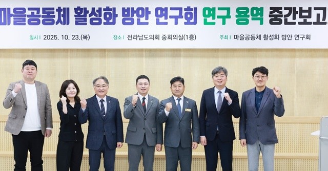 [위키트리 광주전남취재본부 노해섭 기자] 전라남도의회 의원연구단체 ‘마을공동체 활성화 방안 연구회’(대표의원 최정훈)는 10월 23일 도의회 중회의실에서 「지속가능한 지역사회를 위한 주민주도형 마을공동체 활성화 모델 연구」 용역 중간보고회를 열었다. 이번 회의는 연구 진행 상황을 점검하고, 향후 정책 반영 방향을 논의하기 위해 마련됐다.