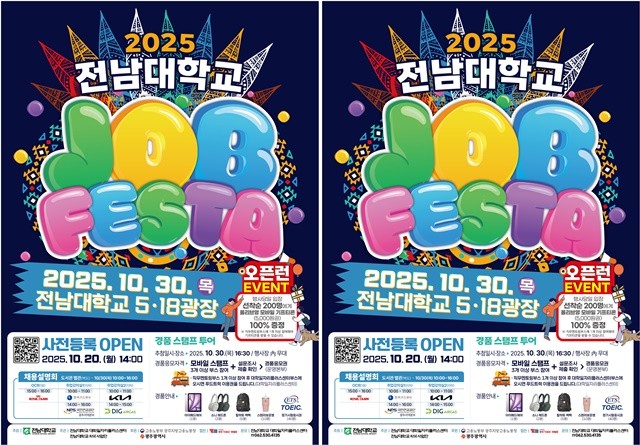 전남대 대학일자리플러스센터(센터장 정난희 교수)는 오는 10월 30일(목) 전남대학교 5·18광장 일대에서 ‘2025 전남대학교 JOB FESTA’를 개최한다고 24일 밝혔다.