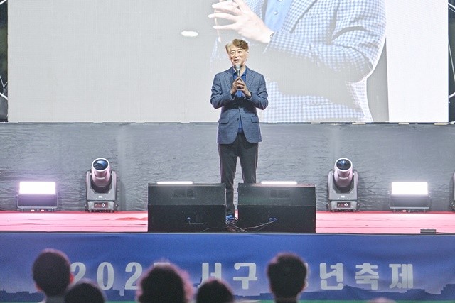 [위키트리 광주전남취재본부 노해섭 기자] 김이강 광주시 서구청장이 25일 풍암동 월드컵경기장 주차장 일원에서 열린 ‘서구 청년축제’에서 인사말을 하고 있다. 광주 서구 제공