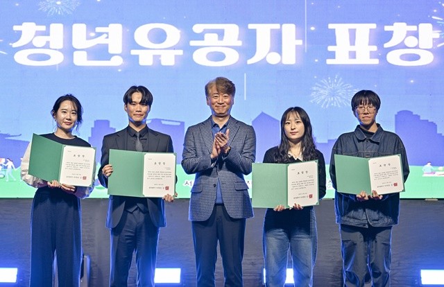 김이강 광주 서구청장이 25일 풍암동 월드컵경기장 주차장 일원에서 열린 ‘서구 청년축제’에서 청년 유공자 표창을 수여한 후 기념촬영을 하고 있다. 광주 서구 제공