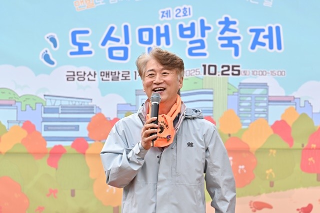 [위키트리 광주전남취재본부 노해섭 기자]김이강 광주시 서구청장이 25일 풍암동 금당산 맨발로(路) 1~3구간에서 열린 ‘제2회 도심맨발축제’에서 인사말을 하고 있다. 광주 서구 제공