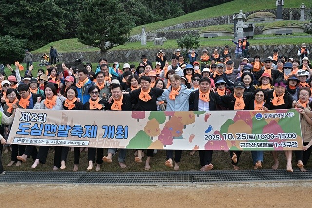 김이강 광주 서구청장이 25일 풍암동 금당산 맨발로(路) 1~3구간에서 열린 ‘제2회 도심맨발축제’에서 맨발걷기 주민동호회 등 참석자들과 맨발 걷기를 하고 있다. 광주 서구 제공