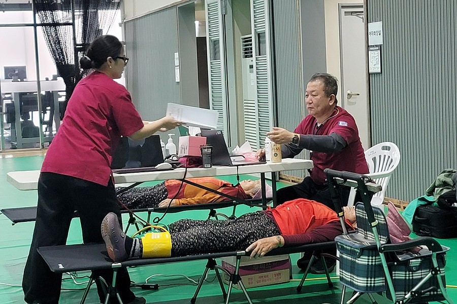 이번 진료에서는 의사·약사·간호사 등 12명의 의료진이 참여해 흉부외과,신장내과 진료와 함께 약처방, 통증주사, 영양수액 치료를 비롯하여 혈압·혈당검사 및 건당상담 등 종합 의료서비스를 제공하였다.