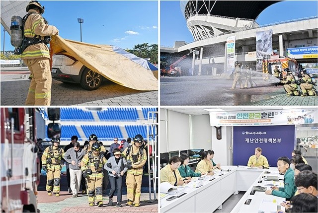 [위키트리 광주전남취재본부 노해섭 기자] 광주시 서구(구청장 김이강)는 27일 서구청 재난안전상황실과 광주월드컵경기장에서 광주광역시, 서부소방서, 서부경찰서 등 20개 유관기관 및 민간단체 등이 참석한 가운데 지진으로 인한 다중이용시설 붕괴 및 화재 발생 대응·복구 등 대형 재난 발생 상황을 가장한 통합연계(토론, 현장) 훈련 ‘재난대응 안전한국훈련’을 실시했다./광주 서구 제공