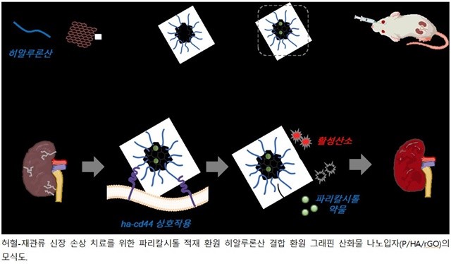 이렇게 항섬유화 약물(P)·히알루론산(HA)·환원 그래핀(rGO)을 결합해 제작한 ‘P/HA/rGO 나노의약’은 활성산소가 많은 병변 부위에서만 약물이 방출되는 ‘활성산소 반응형 약물 방출 메커니즘’을 구현했다. 정상 조직에는 영향을 주지 않으면서 신장 손상 부위에만 선택적으로 작용하는 것이 특징이다.