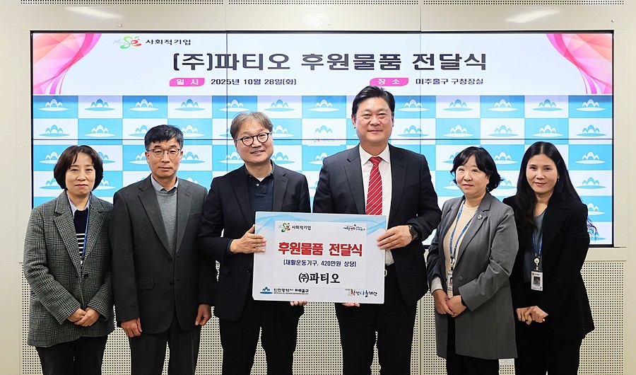 인천 미추홀구(구청장 이영훈)는 지난 28일 구청장실에서 관내 사회적기업인 ㈜파티오(대표 김태균)로부터 재활 운동기구를 전달받았다.