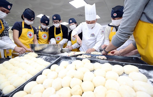 [위키트리 광주전남취재본부 노해섭 기자]29일 광주시 북구청 청년간부회의 임원들이 봉사문화 확산과 나눔 실천을 위해 임동 대한적십자사 광주전남지사 광주봉사관에서 지역내 취약계층 아동과 청소년들에게 나눠줄 소금빵과 피자빵을 만들고 있다.