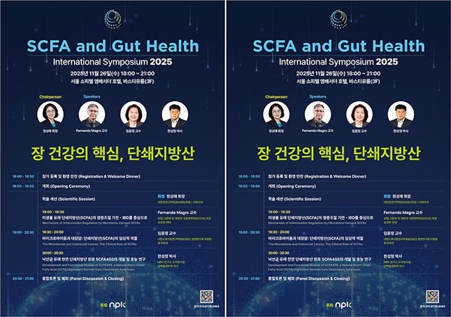 건강기능식품 전문기업 엔피케이㈜(대표 김상준)가 11월 26일 오후 6시 서울 소피텔 앰배서더 호텔에서 'SCFA and Gut Health International Symposium 2025'를 개최한다.