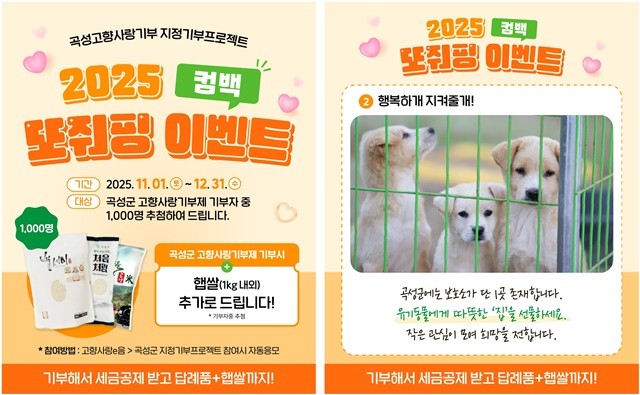 곡성군은 11월 1일부터 12월 31일까지 두 달간 고향사랑기부제 "컴백 또줘핑~~" 이벤트를 펼친다고 밝혔다.