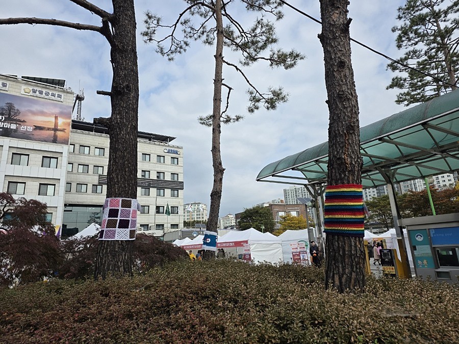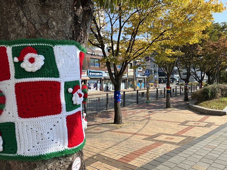 형형색색의 뜨개 옷은 회원들이 공동체 활동을 통해 만든 문화 소통 프로그램의 결과물로, 겨울철 나무 보온과 해충 방지 효과를 제공하며 따뜻한 거리 분위기를 조성했다.