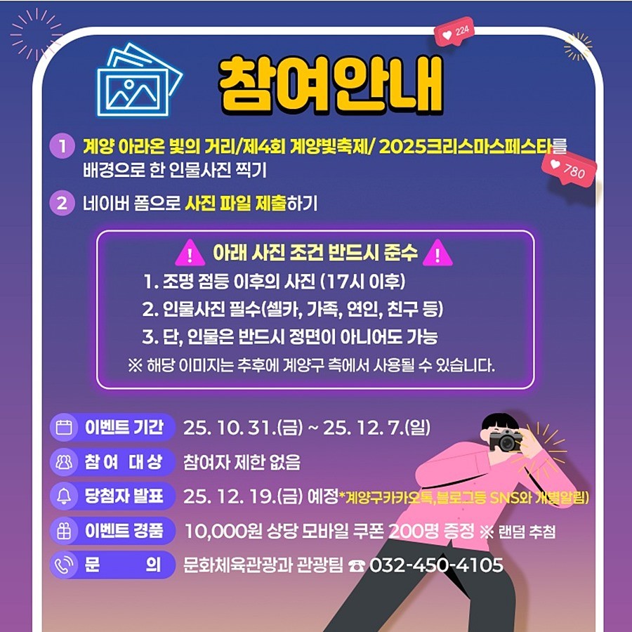 앞서 10월 한 달간 진행된 ‘스탬프투어(관광바우처)’ 이벤트가 12일 만에 조기 소진될 정도로 큰 호응을 얻은 데 이어, 이번 이벤트는 ‘계양아라온 빛의 거리’, ‘제4회 계양 빛 축제’, ‘2025 크리스마스 페스타’를 연계해 진행된다.