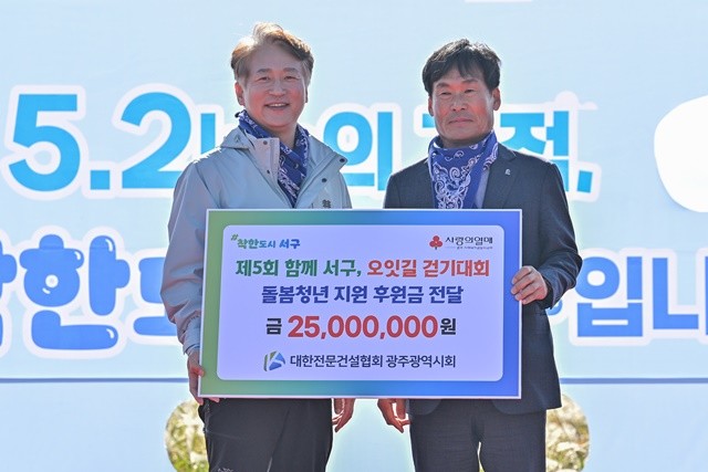 김이강 광주 서구청장이 2일 서구 극락교 하부 일대에서 열린 ‘제5회 함께 서구, 오~잇길 걷기대회’에서 돌봄청년지원 후원금 전달식을 갖고 있다. 광주 서구 제공
