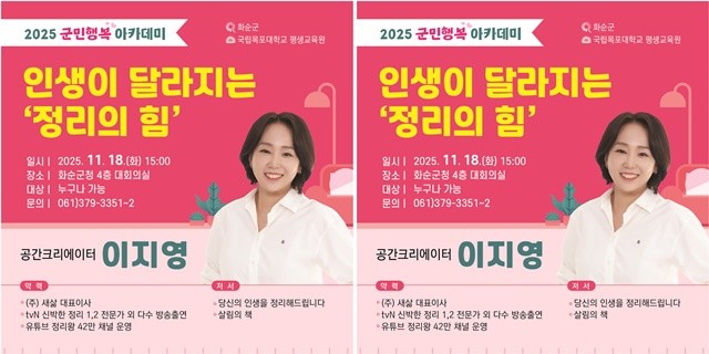 조미화 화순군 인구청년정책과장은 “이지영 강사의 강연을 통해 군민들이 일상 속 정리의 의미를 새롭게 바라보고, 더 행복한 삶으로 나아가는 계기가 되길 바란다”라고 전했다.