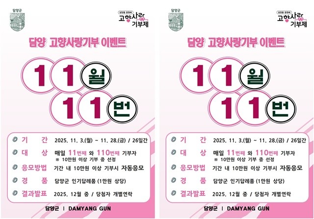 [위키트리 광주전남취재본부 노해섭 기자]담양군(군수 정철원)이 11월을 맞이해 3일부터 28일까지 매일 11번째, 110번째 고향사랑 기부자에게 인기 답례품을 증정하는 이벤트를 진행한다.