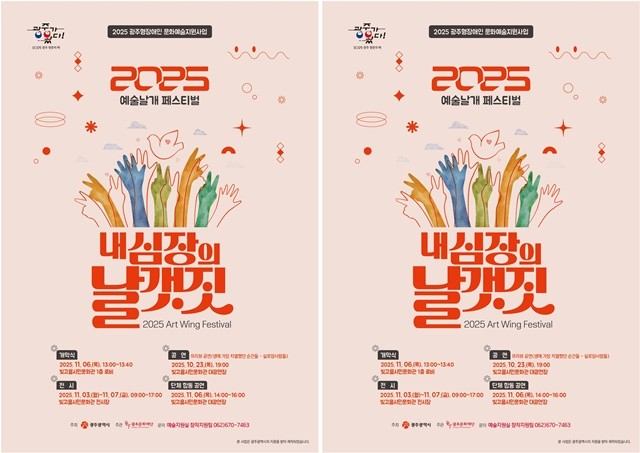 [위키트리 광주전남취재본부 노해섭 기자]광주문화재단이 진행하는 ‘2025 예술날개 페스티벌 – 내 심장의 날갯짓’이 11월 3일부터 7일까지 빛고을시민문화관에서 펼쳐진다. 이번 행사는 사회 각지 17개 기관·단체가 참여해 143점의 시각예술과 실내 공연을 선보이며, 장애 예술계의 빛나는 창작 성과를 시민들과 공유한다.
