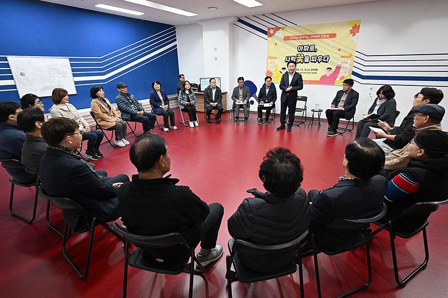 경기 의정부시(시장 김동근)는 지난 5일 롯데캐슬골드파크1단지 아파트에서 입주자대표회의 임원과 입주민 등 20여 명이 참석한 가운데 ‘2025년 찾아가는 U아파트 상담실_아파트, 사람꽃을 피우다’ 간담회를 개최했다.