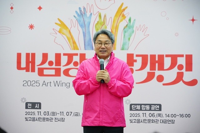 [위키트리 광주전남취재본부 노해섭 기자]강기정 광주광역시장이 6일 오후 남구 빛고을시민문화관에서 열린 '2025 예술날개 페스티벌 개막식'에 참석해 전시작품을 둘러보고 있다./광주광역시 제공